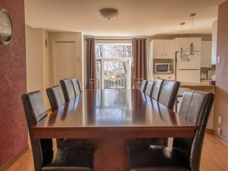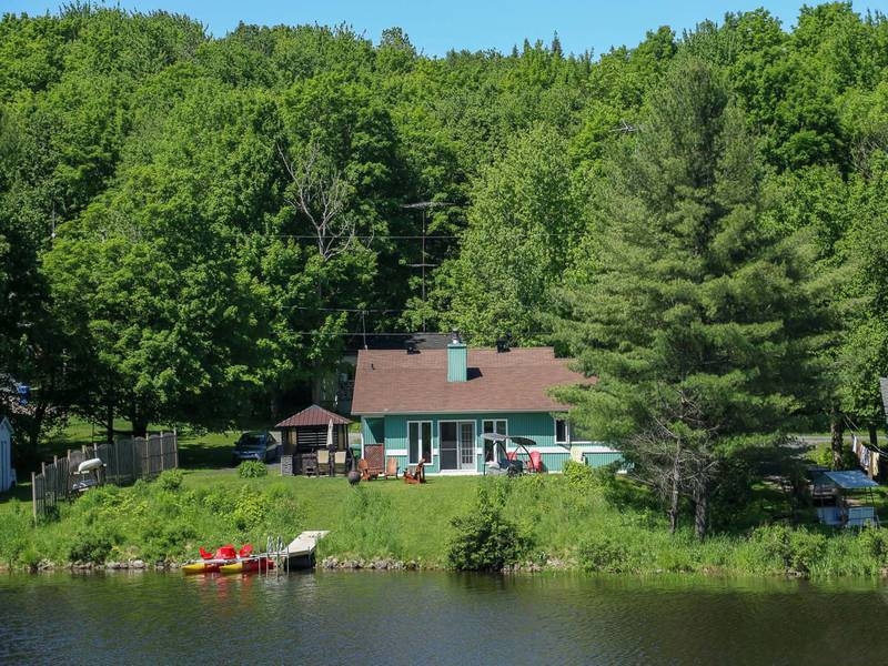 Ce chalet loge dix personnes sur deux étages. L’habitation compte cinq chambres, un espace cuisine équipé, une salle de bain complète et une salle à manger à aire ouverte. De grandes fenêtres laissent pénétrer le soleil, et le salon avec foyer au bois offre une vue sur le lac.